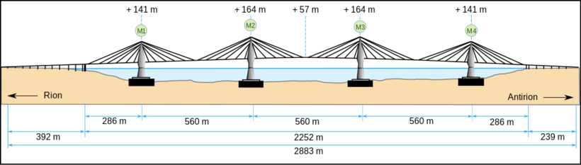 Греки не понаслышке знают, что такое землетрясения. Вся территория Греции, включая полуостров Пелопоннес и многочисленные острова, относится к зоне повышенной сейсмической активности. Проектируемый мост должен был выдержать без повреждений землетрясение в 7-8 баллов, так как подобные сейсмические события случаются в регионе регулярно. По этой причине была выбрана вантовая конструкция моста, которая позволяет подвесить дорожное полотно, изолировав его от основных опор. Сама проезжая часть как бы висит относительно опор моста и может колебаться подобно маятнику во время землетрясений.