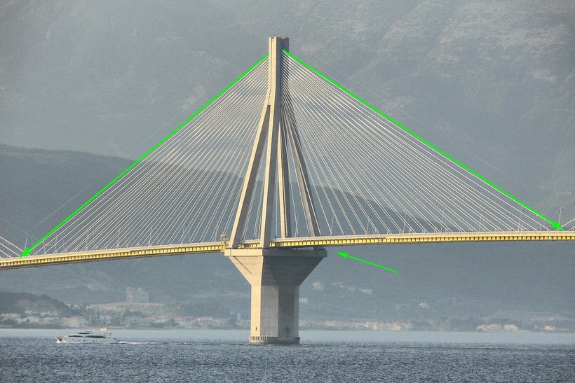 Мост сооружен в самой узкой части залива, который отделяет материковую Грецию от полуострова. Воздушные потоки, проходя сквозь узкое место, значительно увеличивают скорость, а сильный ветер, как известно, не лучшим образом сказывается на устойчивости вантовых мостов. Чтобы избежать возможных повреждений, вызванных сильным ветром, инженерам все же пришлось прикрепить дорожное полотно к основным опорам, но сделали они это не совсем обычным образом. Дорога соединена с опорами, но это соединение регулируется при помощи специальных демпферов. Во время даже самого сильного ветра дорожное полотно стабильно и не подвержено колебаниям, а вот при подземных толчках во время землетрясений срабатывает механизм гашения колебаний: мост начинает раскачиваться, тем самым избегая разрушений.