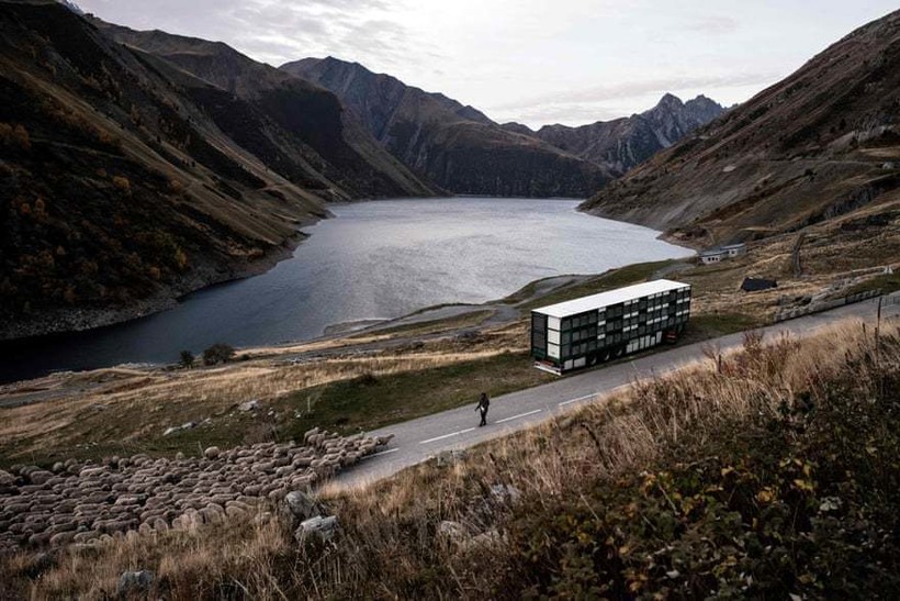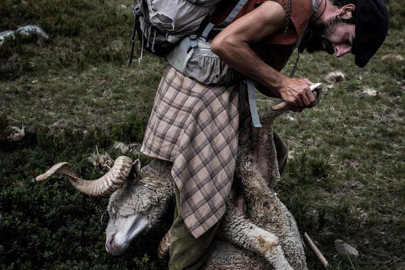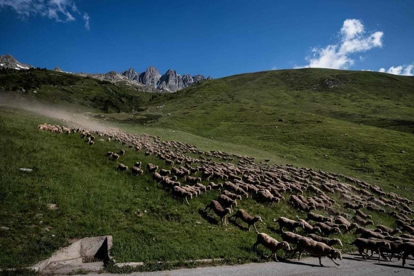 Гаетан Мем в окружении стада овец на фоне одного из самых живописных перевалов Альп — Коль дю Гландон.