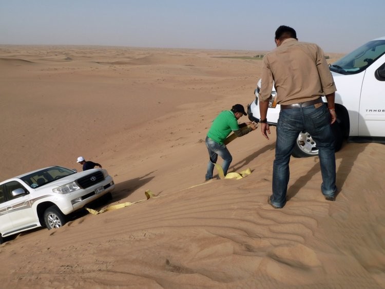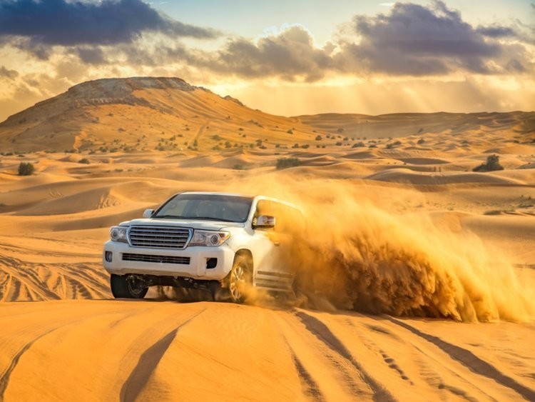 В Дубае путешественники едут в сафари по пустыне через песчаные дюны в поисках острых ощущений.