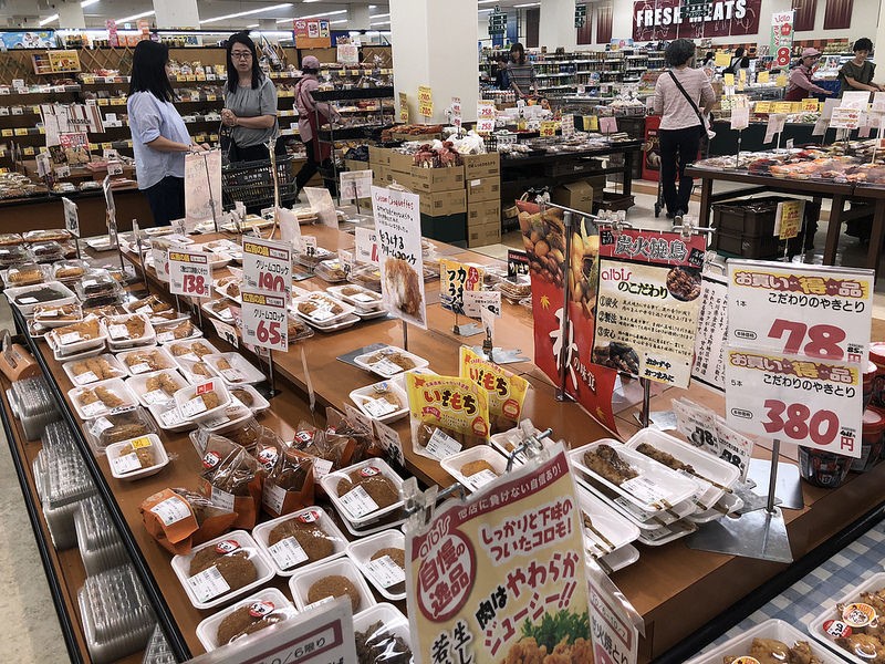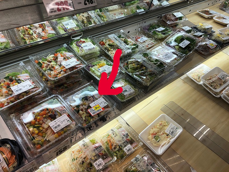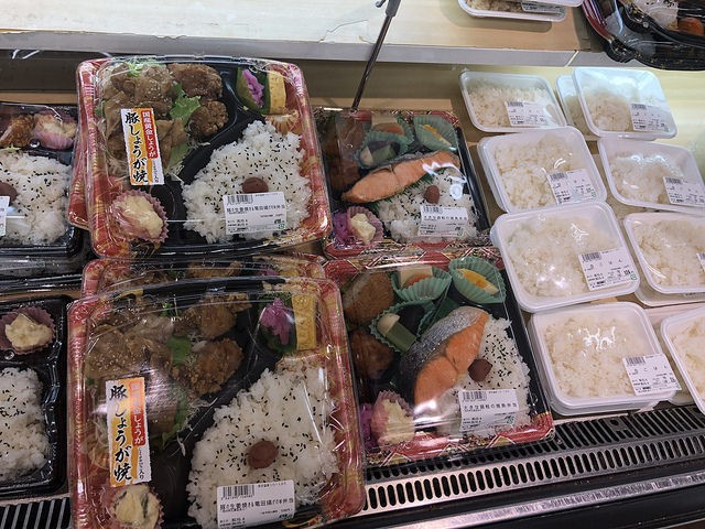 В супермаркете всегда есть отдел готовой еды, она готовится тут же, отравиться практически невозможно. Жареное во фритюре лежит отдельно, зеленые салаты и готовые обеды в коробочке — отдельно. Иногда есть даже станция с карри и супами, ну и, конечно, вареный рис — паршивый, но все равно съедобный.