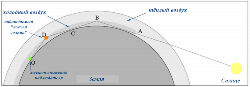 Появление «несуществующего» восхода наблюдается во время температурных инверсий, когда с высотой происходит повышение температуры воздуха. При таких условиях, когда температура воздуха у ледяной, охлажденной поверхности существенно ниже, чем на высоте, происходит многократное отражение и преломление солнечных лучей в инверсионных слоях атмосферы. При этом само солнце фактически находится ниже линии горизонта, а наблюдатель видит лишь его отражение, которое имеет неправильную форму.