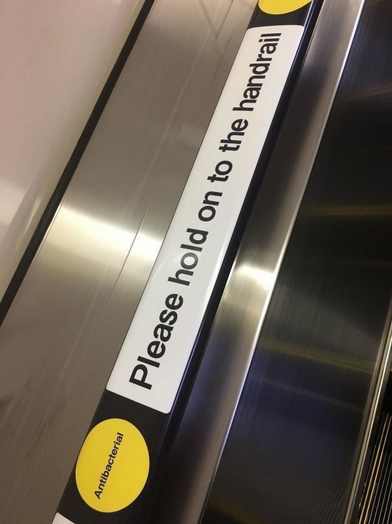 Наклейка в метро гласит, что перила антибактериальные.