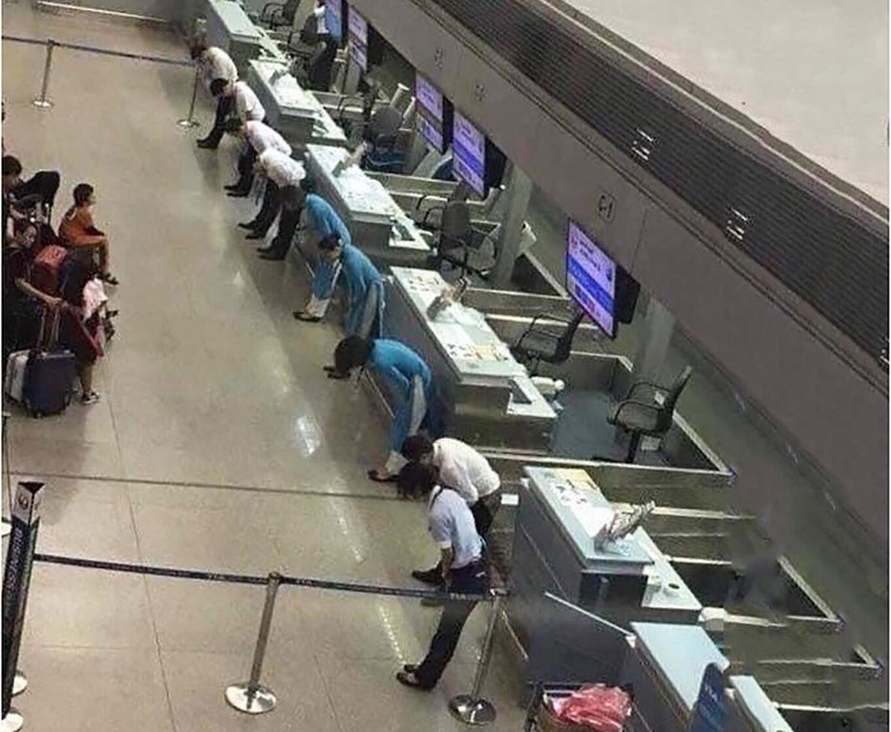 Сотрудники аэропорта в Японии, которые извиняются перед пассажирами за вынужденную задержку рейса.