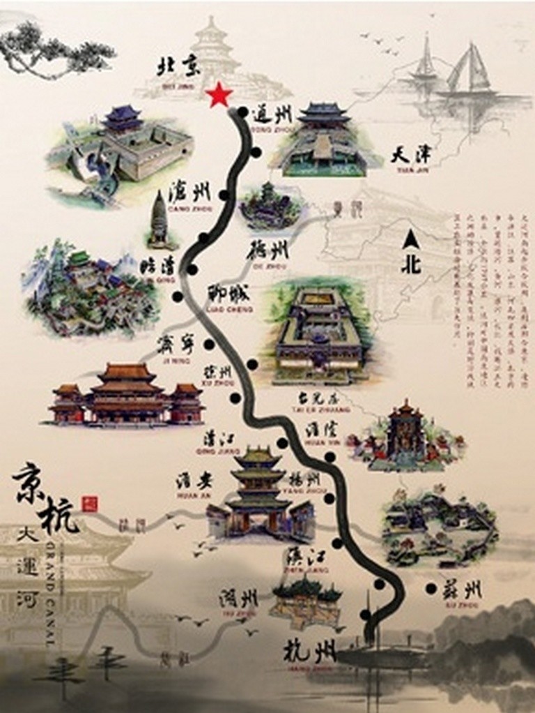 Строительство грандиозного канала началось еще в VI веке до нашей эры. В восточном Китае к тому моменту уже существовало несколько судоходных каналов, которые частично были включены в новую систему. После завершения строительства Великий Китайский канал соединил город Шанхай, расположенный в устье реки Янцзы, с городом Тяньцзинь на реке Хайхэ, впадающей в Бохайский залив Желтого моря. Часть канала — это русла рек и акватории озер, которые вошли в систему судоходного канала. Помимо Янцзы и Хуанхэ, канал соединяет реки Хайхэ, Хуайхэ и Цяньтан.