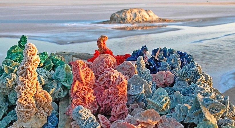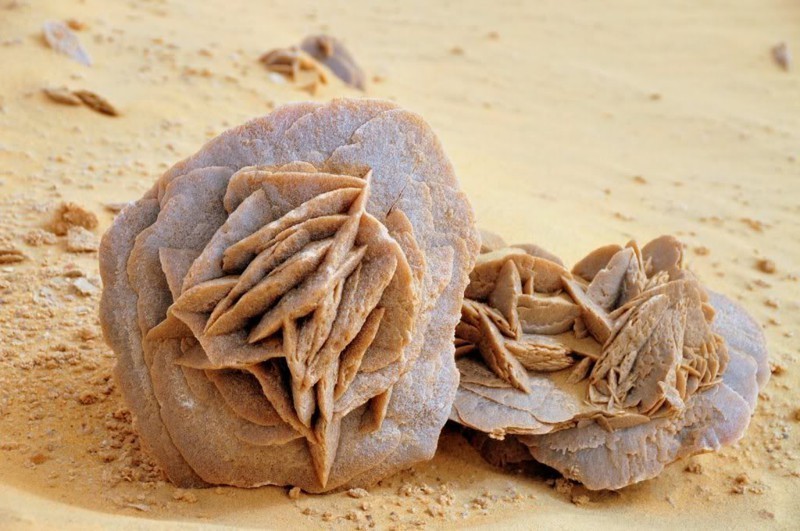 Озеро Шотт-Эль-Джерид получило широкую известность благодаря гипсовым «розам пустыни», которые добываются на его дне. «Розами пустыни», или каменными цветами, называют причудливые образования из гипса с примесями песка, которые внешне напоминают цветы роз. Гипс — это осадочный минерал, гидрат сульфата кальция, который в природе встречается в форме кристаллов, друз или вот таких необычных каменных цветов. Каждая «роза пустыни» состоит из нескольких линзовидных кристаллов, которые образуются в толще песка на дне озера в сезон дождей. Когда в районе высохшего озера начинают идти дожди, соли гипса вымываются в нижние песчаные слои, где они кристаллизуются, приобретая самую разнообразную форму. В «розах пустыни» помимо основного минерала (гипса) всегда присутствует песок, за что их иногда называют «песчаными розами». Такие гипсовые розы находят и в других местах Сахары, где есть отложения солей гипса.