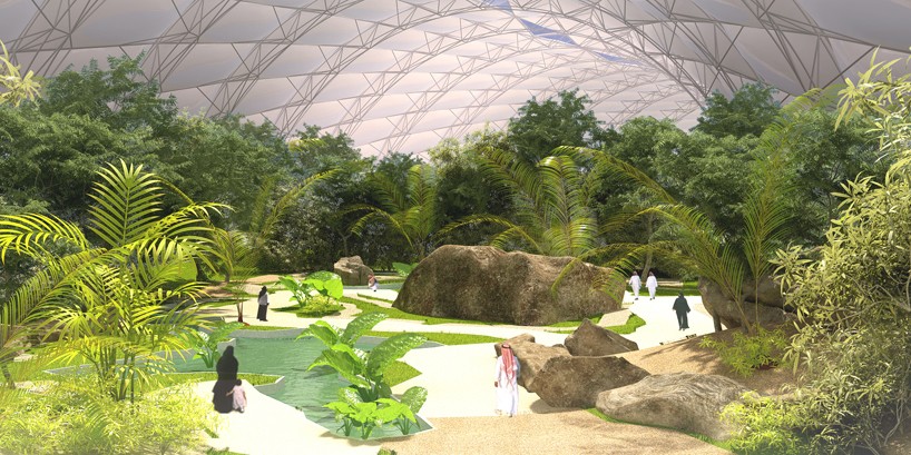 В центральной части садов планируют расположить закрытые павильоны — теплицы с влаголюбивыми растениями, музей естествознания, развлекательные площадки для детей и зоны отдыха. Планируется, что собранные в этом саду растения будут эмитировать флору мелового и юрского периода, когда на Аравийском полуострове росли тропические леса, а посетители смогут почувствовать себя путешественниками во времени. Центральное здание будет иметь форму полумесяца, а под открытым небом будет располагаться другая часть садов. Здесь планируют разместить парковую зону с растениями и вольеры, где будут обитать экзотические звери и пернатые. Растения для открытого сада подберут из флоры пустынь и полупустынь, которые приспособлены с жаркому и сухому климату.