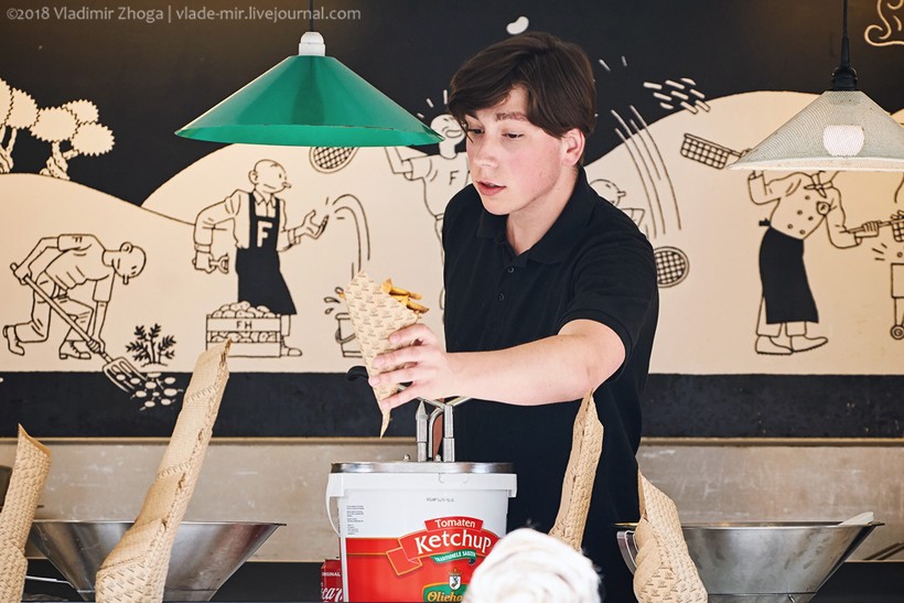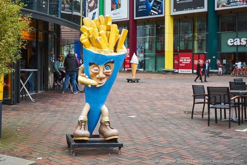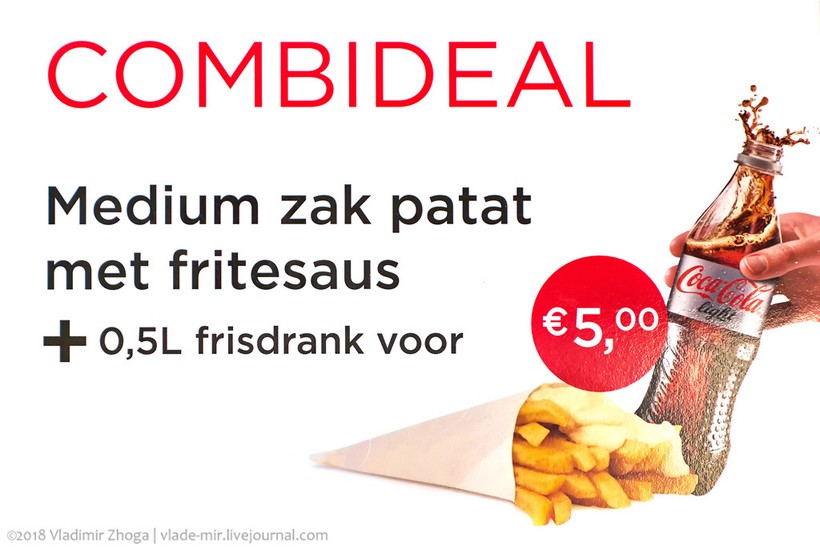 В Нидерландах это блюдо называется просто Frites. Его едят все, всегда и везде. Вы неоднократно будете видеть людей на улицах, которые просто едят картошку фри. Но попробовали бы вы эту картошку! Голландцы не были бы голландцами, если бы для своих frites-ов не вывели специальный сорт картофеля. Да, здесь фри делается из натуральной картошки, а не из прессованного порошка, наверное, именно поэтому она здесь какого-то необыкновенного вкуса! А какого она размера! Представляю эти гигантские клубни картофеля, из которого они нарезают такую длинную и толстую соломку.