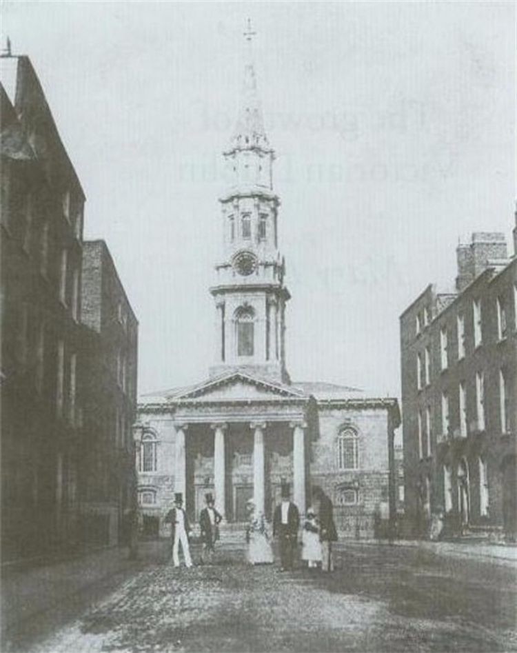 На заднем плане можно увидеть шпиль Церкви Святой Марии. Берлин, 1840 г., Лейпцигская улица.