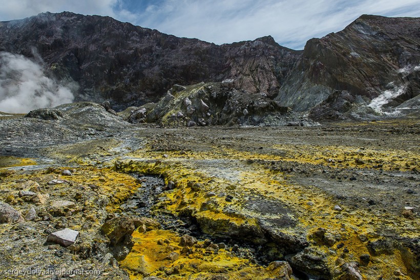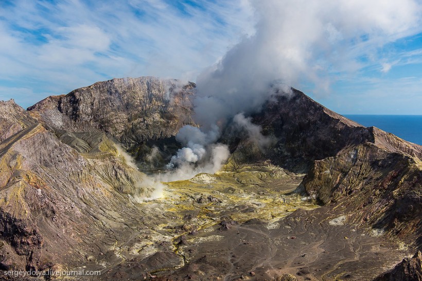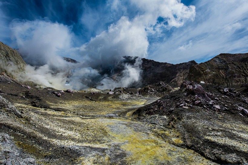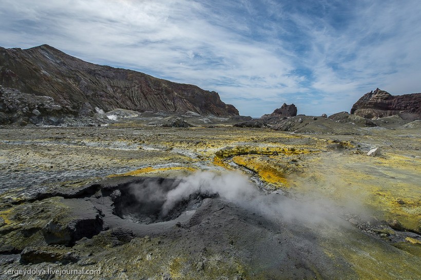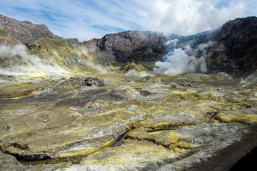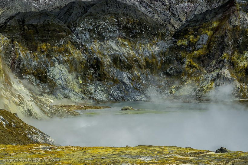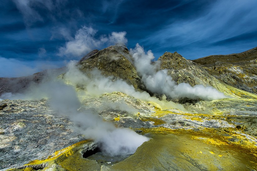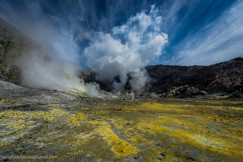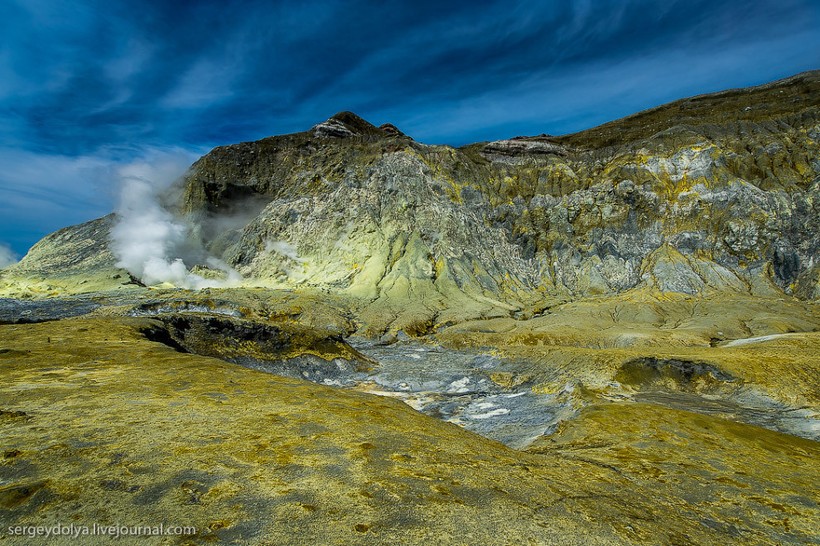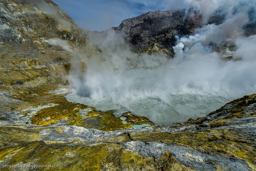 Остров Уайт в Новой Зеландии не совсем остров. На самом деле это действующий вулкан, большая часть которого скрыта под водой. На поверхность выходит лишь макушка диаметром в два километра. Пейзажи острова изобилуют кислотными и неестественными красками, отчего кажется, что попал на другую планету. Не знаю, снимали ли тут фантастические фильмы, мне кажется, это самое подходящее место.