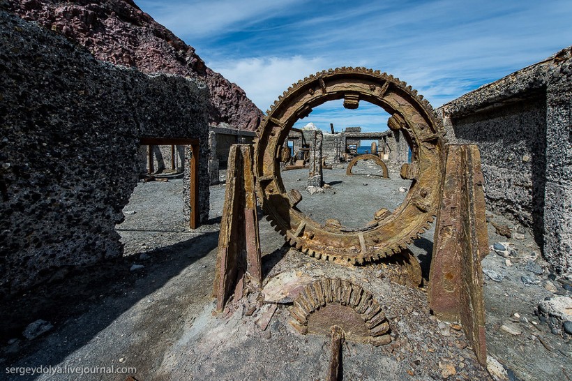 Улетаем с острова. Разрушенный серный завод на побережье.