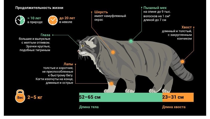 Манулы имеют небольшие размеры и по своим параметрам сравнимы с домашними кошками. При длине тела 50-65 сантиметров взрослые особи весят от 2-х до 5 килограммов, хотя со стороны кажется, что они гораздо тяжелее.