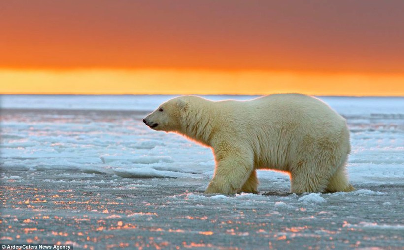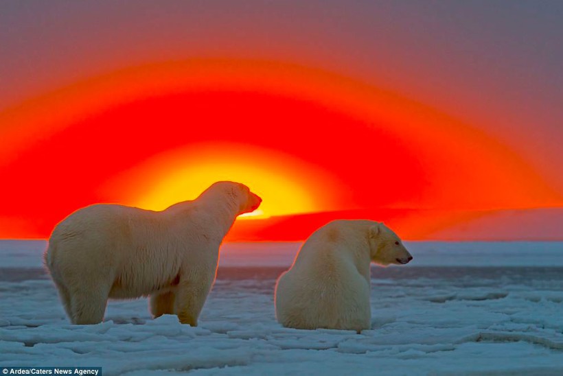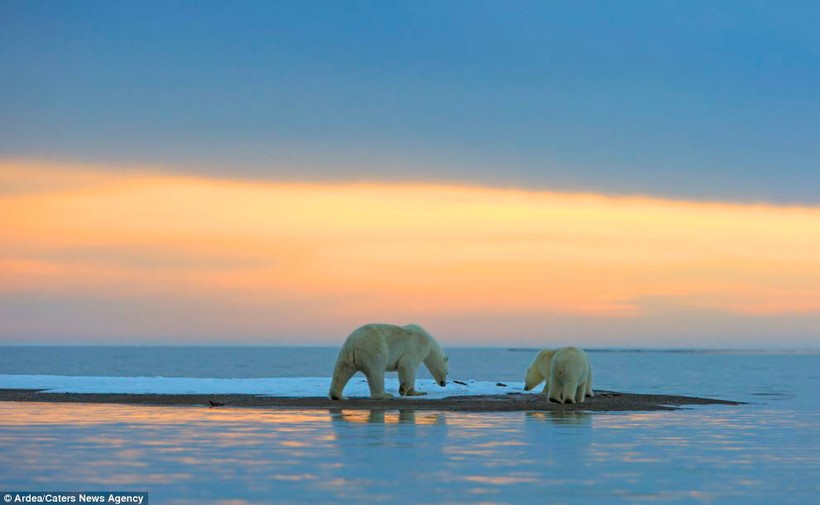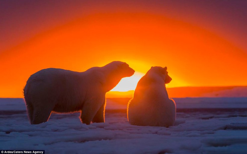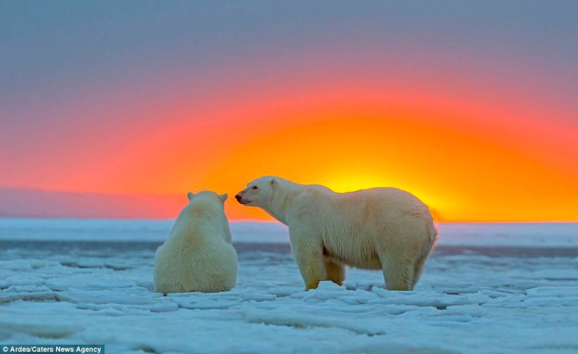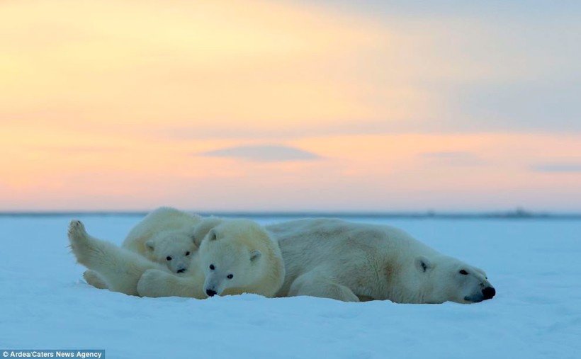 Французскому фотографу Сильвену Кордье (Sylvain Cordier) пришлось две недели следовать по пятам медведицы с детенышами, чтобы «пообщаться» с животными с глазу на глаз и сделать эти изумительные снимки. Как он сам рассказывает, ему очень повезло встретить такую спокойную и дружелюбную семью. В результате медведица позволила их лодке подойти совсем близко к берегу. А однажды начался настолько красочный закат, что даже медведи остановились и словно бы стали наслаждаться буйством красок.