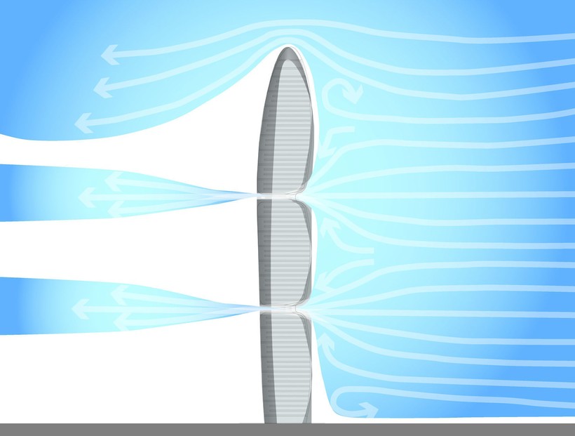 Город Гуанчжоу, расположенный на юго-восточном побережье Китая, известен своими тропическими циклонами, которые регулярно приходят с просторов океана. Строительство высотных зданий в этом мегаполисе, как и во всех остальных, является вынужденной мерой, позволяющей сэкономить драгоценное городское пространство в условиях стремительного роста населения. Помимо обычных инженерных трудностей, связанных с возведением столь тяжелых и высоких конструкций, проектировщикам пришлось учитывать и сильные ветры, которые здесь не редкость. Но во время работы над проектом инженерам пришло в голову гениальное решение: превратить проблему в преимущество, используя разрушительную силу ветров на благо.