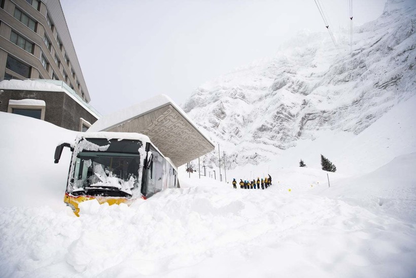 Рабочие выгребают снег в швейцарском ресторане. На него сошла лавина