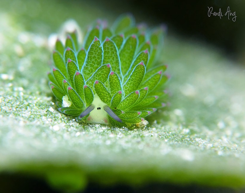 Это создание называется Costasiella kuroshimae или морская овца. Прелестный маленький морской слизняк с глазами-бусинками и милыми усиками, которые делают его похожим на мультяшную овечку, поедающую водоросли.