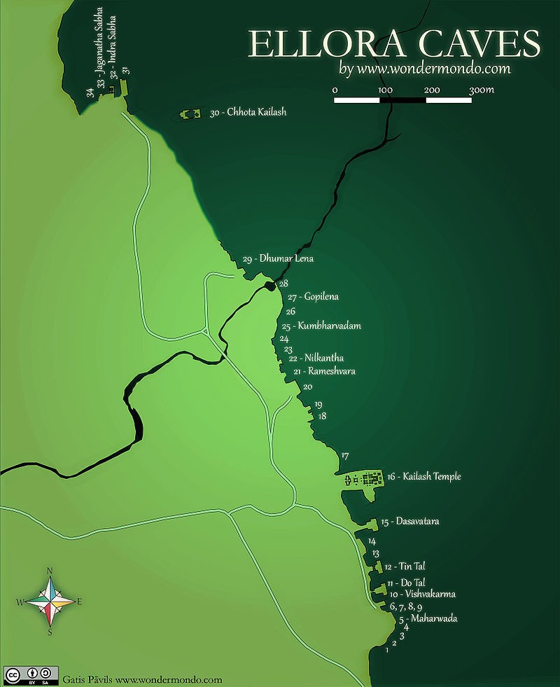 Всего в районе Эллоры насчитывается 34 скальных храма, которые сгруппированы в зависимости от религиозной принадлежности. Самые ранние сооружения — это 12 буддийских святилищ, которые относятся к временному промежутку VI-IX веков. Наряду с буддизмом в Индии был широко распространен индуизм, поэтому 17 скальных храмов Эллоры посвящены индуистским богам. Здесь также имеется 5 храмов приверженцев джайнизма, которые были построены в IX-X веках. Святилища высечены прямо в горных склонах, к которым ведут лабиринты лестниц и внутренних дворов. Чаще всего это небольшие углубления, украшенные изящной резьбой, в которых располагаются религиозные святилища.