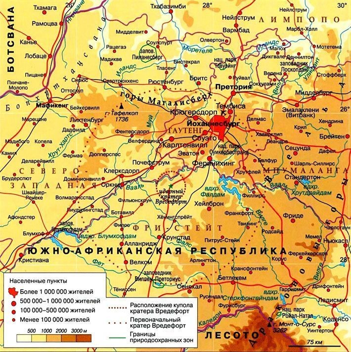 Вредефорт находится в провинции Фри-Стейт, в центральной части ЮАР. Диаметр кратера достигает примерно 250-300 км, а небесное тело, столкновение с которым привело к столь грандиозным последствиям, имело диаметр около 10 км. Как полагают ученые, катастрофа планетарного масштаба произошла более 2 миллиардов лет назад.