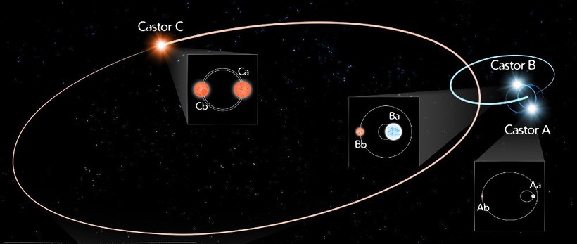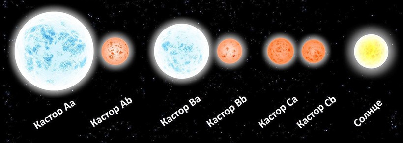 Но звездные пары, составляющие Кастор, существенно отличаются друг от друга. Самая крупная звезда в этой система — Аа, которая является белой звездой. Вокруг нее вращается красный карлик под названием Аb. Вторая пара по типу звезд похожа на первую, с той лишь разницей, что звезда Ва несколько уступает лидеру по размерам. Третья пара — это два красных карлика. Эта двойная звезда существенно уступает по массе основным двойным звездам и вращается вокруг них по эллиптической орбите, и это выглядит весьма необычно.