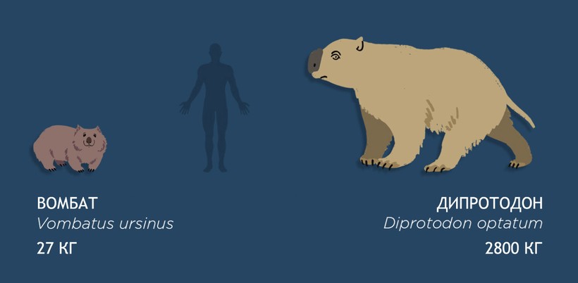 Современные вомбаты, обитающие на территории Австралии, небольшие сумчатые зверьки, вес которых не превышает 40-45 килограммов. Они живут в норах, питаются растениями и при желании легко приручаются людьми. Но их ближайшие родственники, бывшие современниками первых аборигенов Австралии, весили около 2000 килограммов, и были значительно крупнее. Эти животные, скорее всего, не помещались в норах, да и с людьми не очень дружили. Они превосходили размерами самых крупных кенгуру и даже сумчатых львов и были самыми крупными сумчатыми животными из всех, когда-либо обитавших на планете.