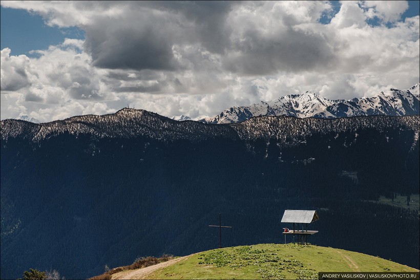 Крест виден в Местиа почти отовсюду, главное знать, куда смотреть, и делать это внимательно. Путь не слишком далек — всего 4 километра, но вот подъем на эти 4 километра составляет почти 800 метров — так что в жаркий день вам придется непросто. Зато какие тут виды!