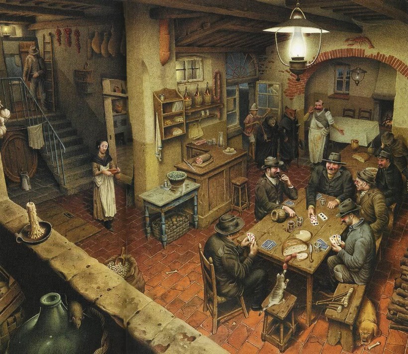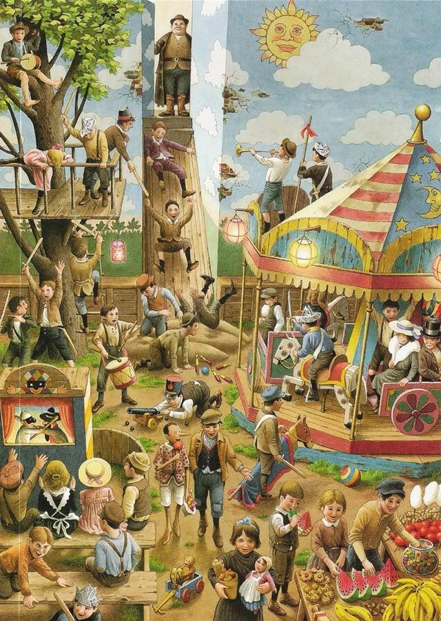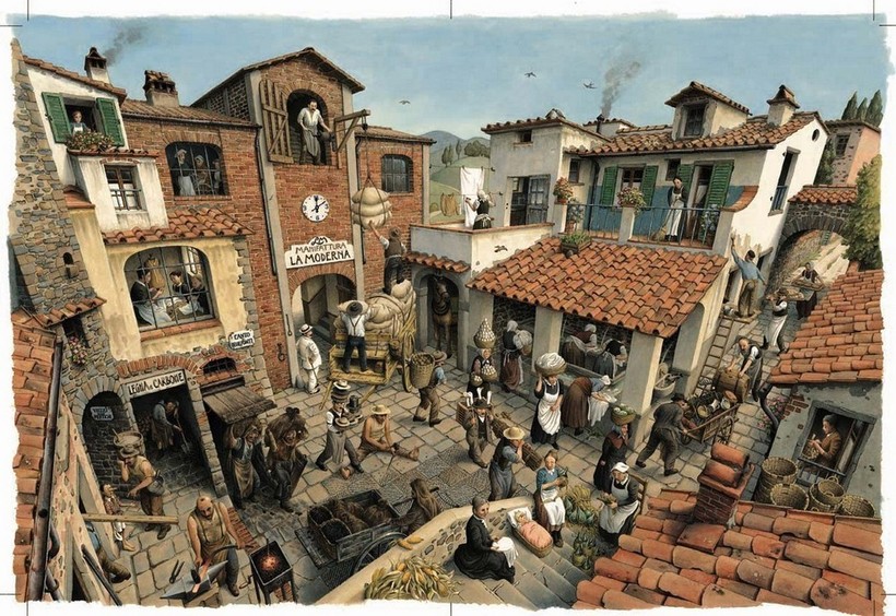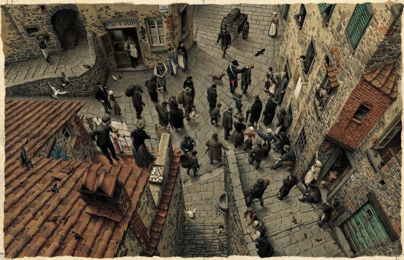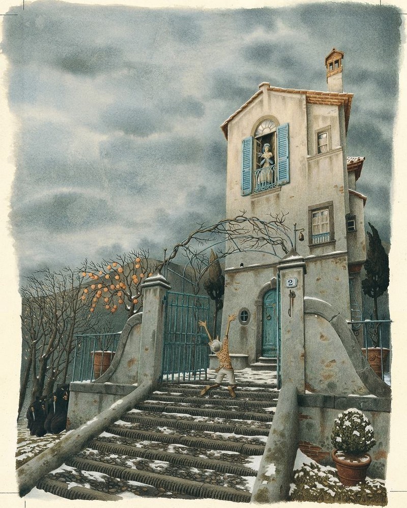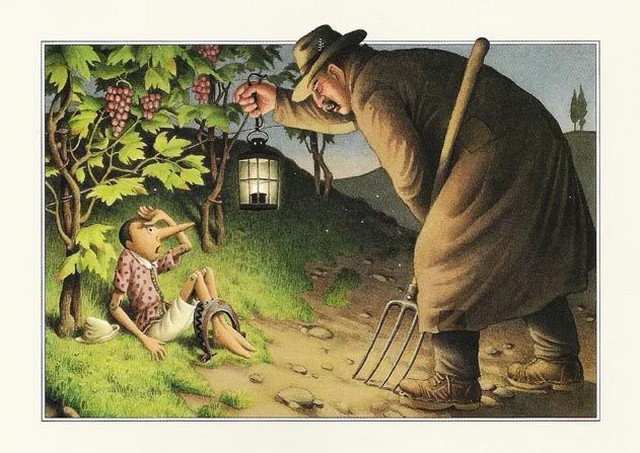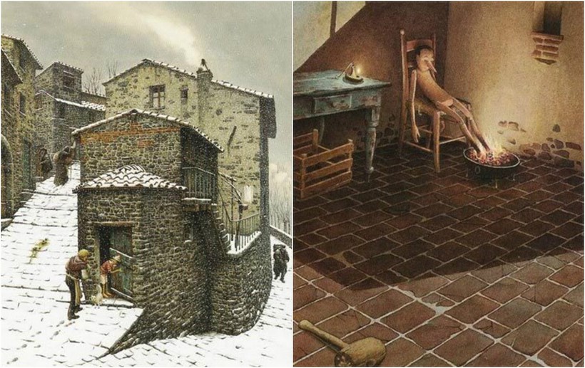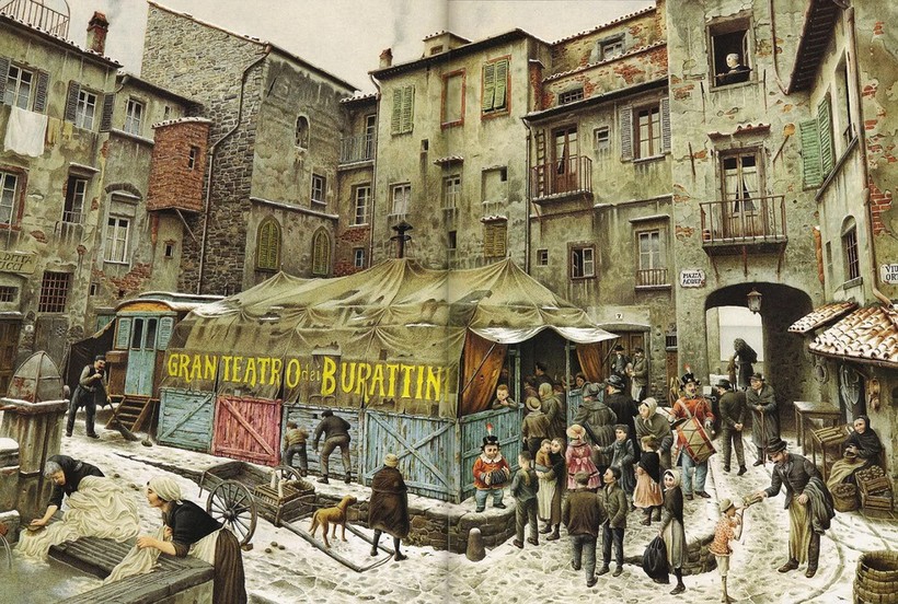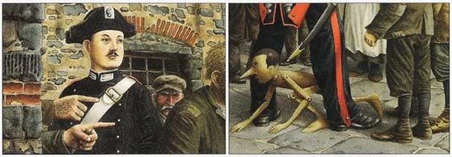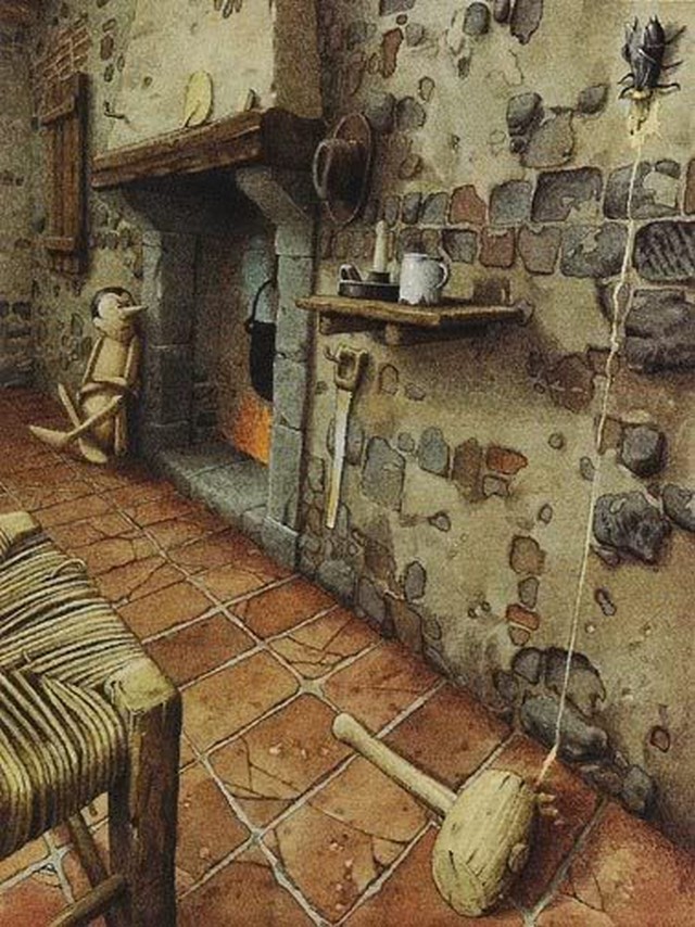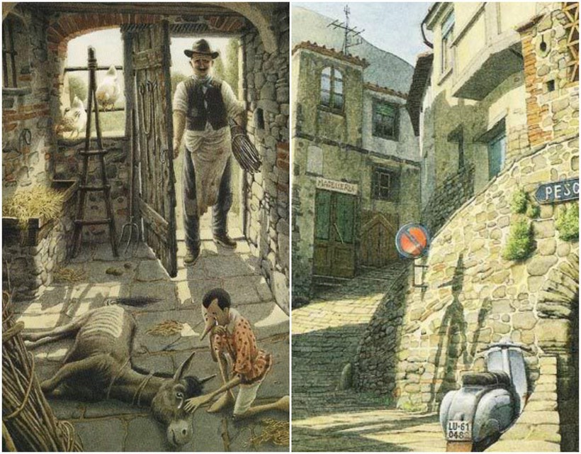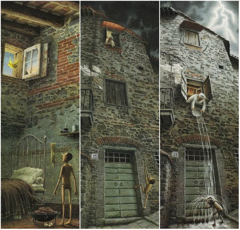 От картинок к детской книге никто не ожидал такой необыкновенной детализации и порой пугающей атмосферности. Визуализация истории мальчика, сделанного из бревна, в исполнении итальянца выглядит хоть и не очень по-детски, но весьма впечатляюще. Одним из главных приемов Инноченти являются потрясающие общие планы, прорисованные с такой точностью и скрупулезностью, что разглядывание их, кажется, может занять больше времени, чем прочтение самой истории.