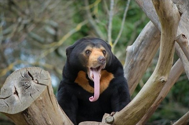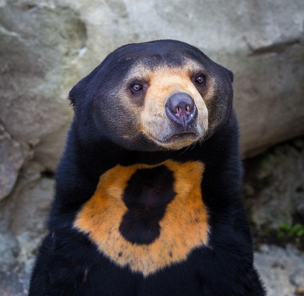 Этот косолапый обитает в тропических и субтропических лесах предгорий и гор Юго-Восточной Азии. Он хорошо лазает по деревьям, а тонкий и длинный язык помогает добывать мед и выковыривать любимых термитов из гнезд. Еще одна особенность — беловатое или рыжее пятно в виде подковы на груди животного. По форме и цвету оно напоминает восходящее солнце: вот откуда научное название рода «Солнечный медведь».