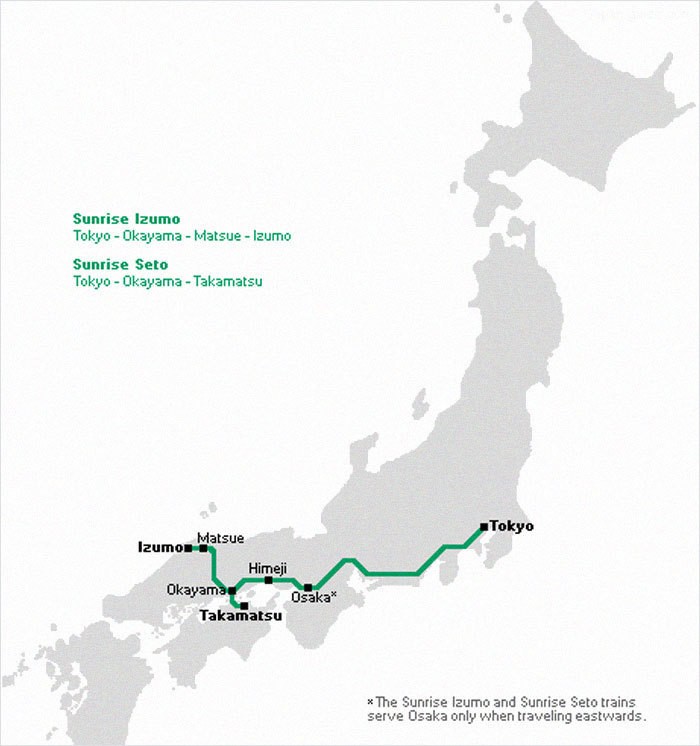 Каждый день Sunrise Seto и Sunrise Izumo выезжают из Токио в 10 часов вечера и к 7:27 и 9:58 приезжают в Такамацу и Идзумо соответственно. Таким образом, путешественники, пользующиеся этими маршрутами, могут сэкономить и исключить затраты за одну ночь в гостинице.