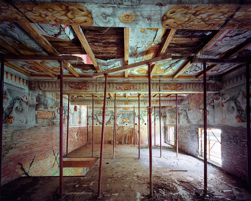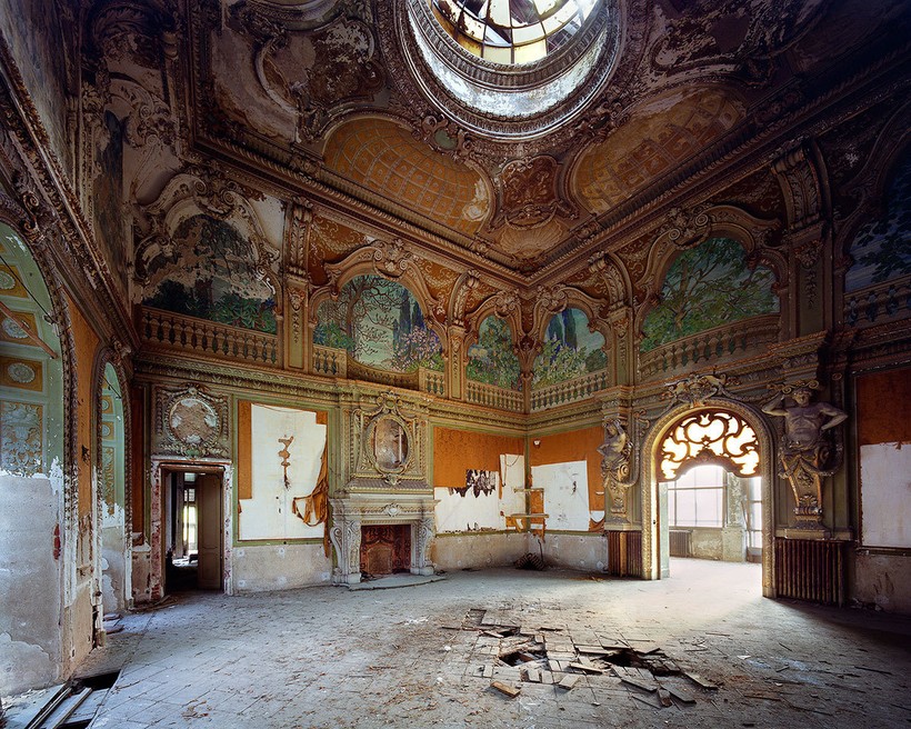 Каждый интерьер, все еще богатый изысканной декоративной росписью, постепенно превращается в полнейший хаос и царство тления. Цель фотографа — запечатлеть индивидуальности всех этих некогда по-королевски роскошных помещений.