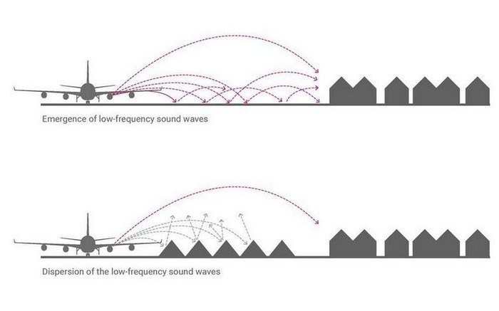 Ряды искусственных холмов высотой 2 метра расположили таким образом, чтобы они гасили шумовые волны, идущие со стороны взлетно-посадочных полос. Инженеры рассчитали оптимальное расстояние между холмами для эффективного шумопоглощения, которое составило 10 метров, а всего таких барьеров было сооружено 150. Кроме того, было устроено несколько водных каналов, которые также призваны бороться с распространением шума на дальние расстояния.
