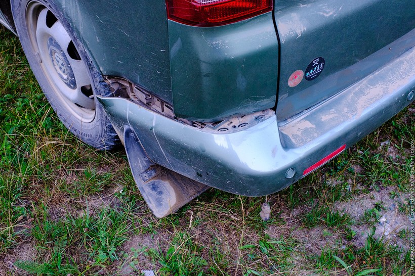 А какие злые тут были комары! В общем, семья заперлась в салоне, а я пошел чинить машину. Проводку восстановил элементарно, благо что инструмент с собой в наличии. А вот с датчиком уже ничего не поделаешь, только менять. Бампер в итоге тоже встал на свое место, правда, с небольшим зазором в 3-4 миллиметра. <...> В итоге полностью решили эту проблему только вернувшись домой.