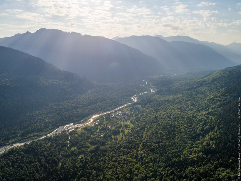 Запускаю в небо дрон. Дорога по ущелью в сторону Абхазии.