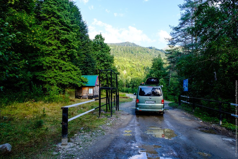 За поселком Пхия преодолеваем небольшой каменистый брод (на мультивэне, ага) и упираемся в начало погранзоны. До Абхазии остается 20 километров. На КПП пусто, но нарушать как-то не особо хочется, так что фотографируемся на память и разворачиваемся.