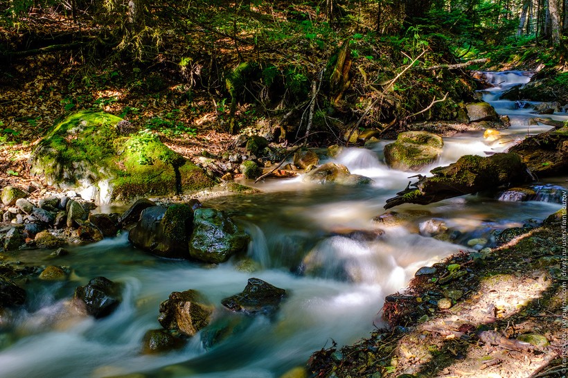 По пути постоянно встречаются мелкие ручьи и водопады, а так как все это дело находится посреди леса, то даже в полдень получается фотографировать на длинной выдержке без дополнительных фильтров, размывая тем самым воду «в молоко». Постоянно останавливаемся, чтобы сделать фотографии и поснимать видео.