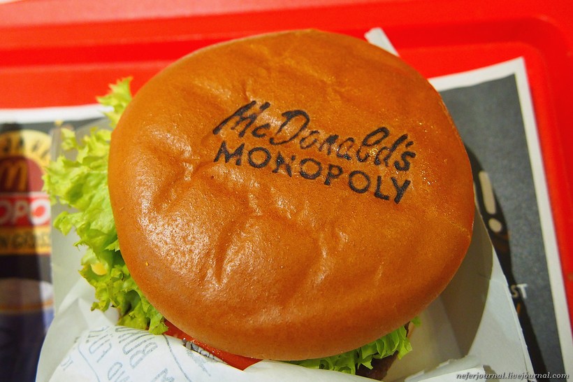 Это игра «Монополия в Макдоналдс». На каждый продукт, участвующий в акции, приклеен стикер. Есть два вида стикеров: «Собери коллекцию» и «Моментальный приз». Квартиру фиг выиграешь, глупо на это надеяться, а продуктовый приз получить приятно и более вероятно. В перечне: капучино, пирожок с вишней, картофель фри, прохладительный напиток, вафельный рожок и чизбургер.