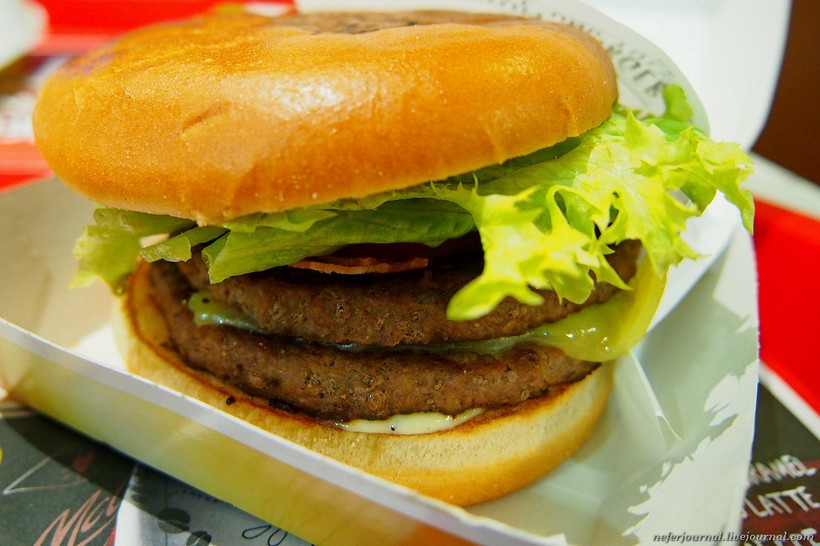 Во второй раз купила Макдабл Чили Чиз, такого тоже ни разу не пробовала. В дополнение — салат Цезарь, он оказался огромным. Целый таз всяких овощей и курица в панировке. Честно говоря, на Цезарь не очень похоже.