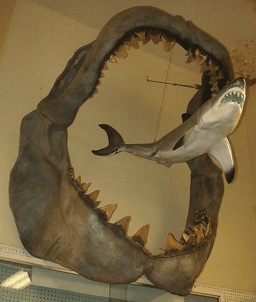 Челюсти мегалодона в сравнении с современной белой акулой.