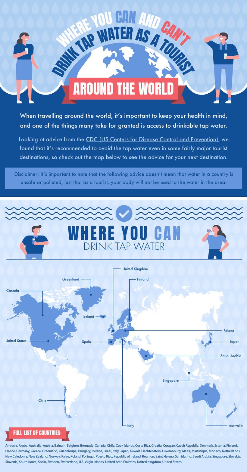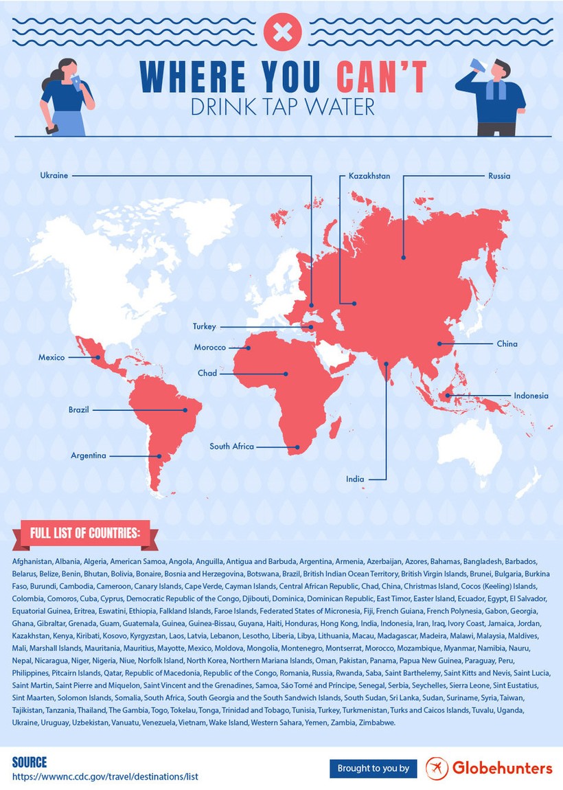 Если вы часто путешествуете по миру, то наверняка уже не раз сталкивались с вопросом качества и безопасности водопроводной воды. Всемирный центр контроля заболеваний рекомендует с осторожностью утолять жажду в разных странах мира.
