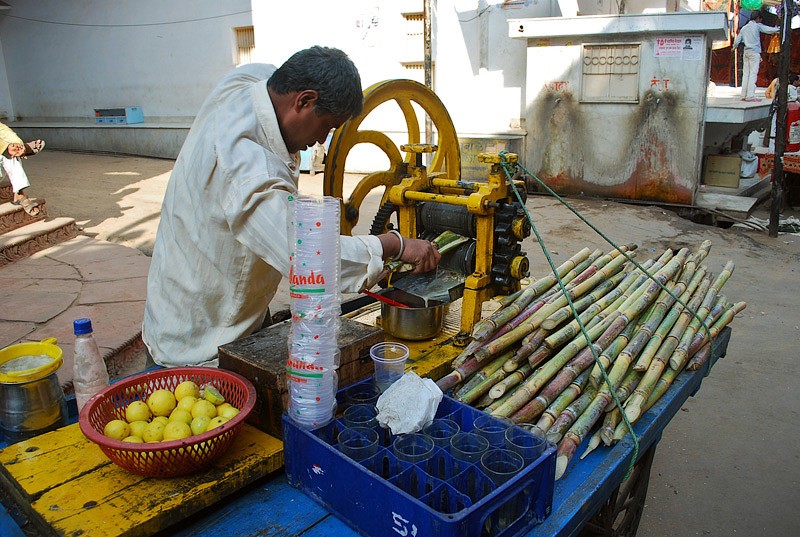 Изготовление тростникового фреша в Пушкаре. Мы подошли, наблюдаем за процессом. Индийская семья покупает дочке фреш.