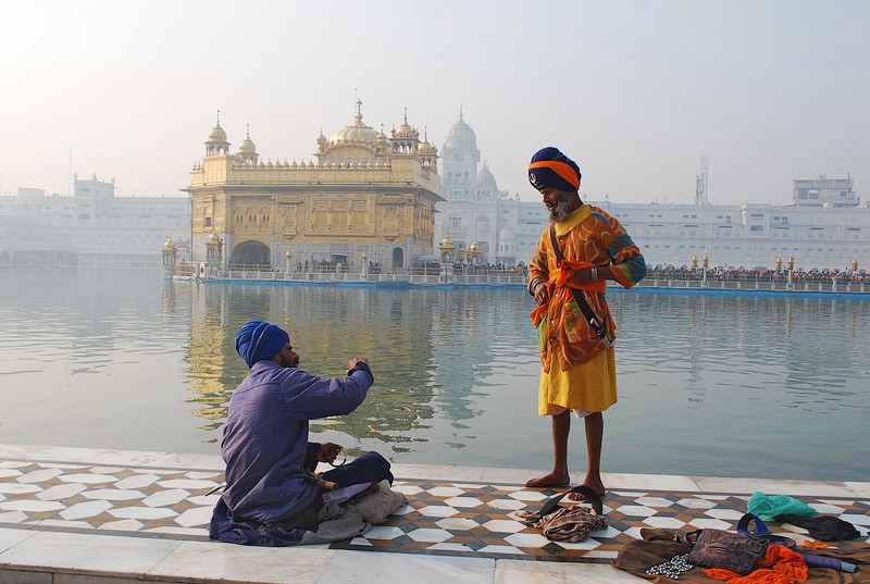 Дедушка-модник в Золотом храме, Амритсар. На чалме у него логотип сикхов, на поясе — кинжал. Чалма и кинжал — обязательные составляющие экипировки правильного сикха.