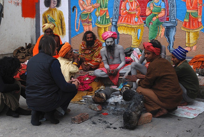 Тусовка просветленных на одном из гатов в Варанаси. Они себе сделали на улице такой маленький храм, чтобы подойти к ним, нужно снять обувь. Мужчина с неброской белой краской на теле — гуру-учитель. Слева от него адепт в оранжевой повязке самозабвенно курит гашиш через трубку. Слева двое французов подошли поговорить о высоком.