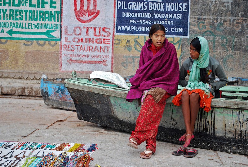 Девочки продают бусы в Варанаси. В Индии начинают работать в раннем возрасте. Большинство людей, задействованных в околотуристическом бизнесе, неплохо знают английский, даже дети. У них есть хороший стимул учить язык.
