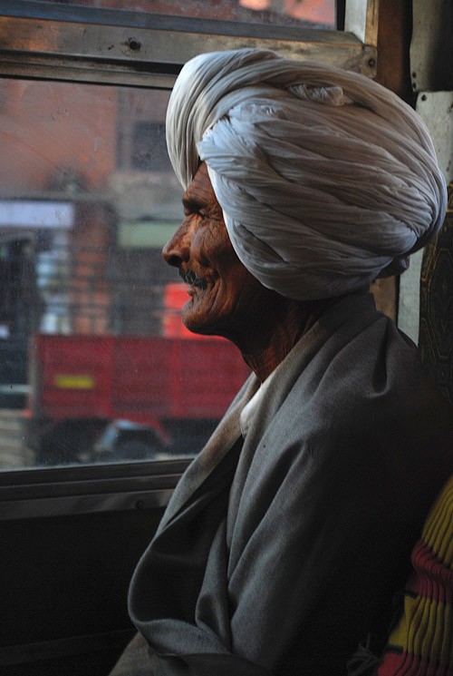 Дедушка в автобусе Джайпур-Пушкар. После долгих наблюдений я пришел к выводу, что количество мотков в чалме зависит от возраста. У мальчиков-сикхов чалмы совсем маленькие, пара оборотов и наверху небольшая шишка. У мужчин среднего возраста — среднее количество слоев. Говорят, цвет ткани тоже имеет значение.