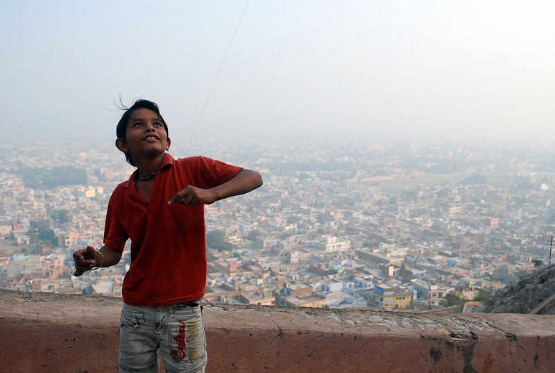 В свободное от раскулачивания белых туристов время мальчики неистово рубятся в крикет или запускают воздушных змеев. Джайпур, подъем к Tiger Fort. Огромное количество детей пускает змеев, в них все небо. Над индийскими городами сильный смог, воздух загрязненный.