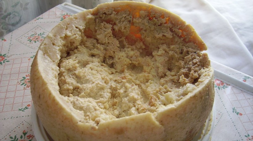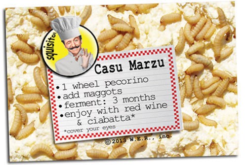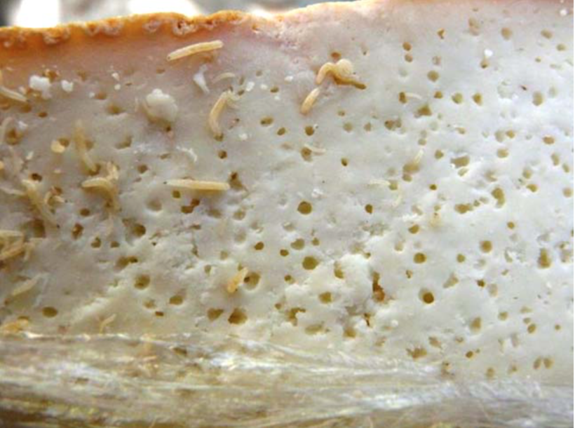 Сыр с личинками носит название касу марцу и является блюдом национальной кухни сицилийцев. С итальянского его название переводится как «гнилой сыр». Основу этого странного блюда составляет сыр пекорино, который производят на Сардинии и в некоторых регионах Италии из овечьего молока. Когда сыр пекорино готов, его оставляют на открытом воздухе и дают возможность сырной мухе отложить в него свои яйца. Для привлечения мух в сыре делают небольшие отверстия, куда капают оливковое масло. Поскольку это насекомое часто встречается во всех регионах планеты, а особенно вблизи приморских городков, где ловят рыбу, то нет никаких сомнений в том, что каждая приготовленная головка сыра пекорино будет найдена сырными мухами.