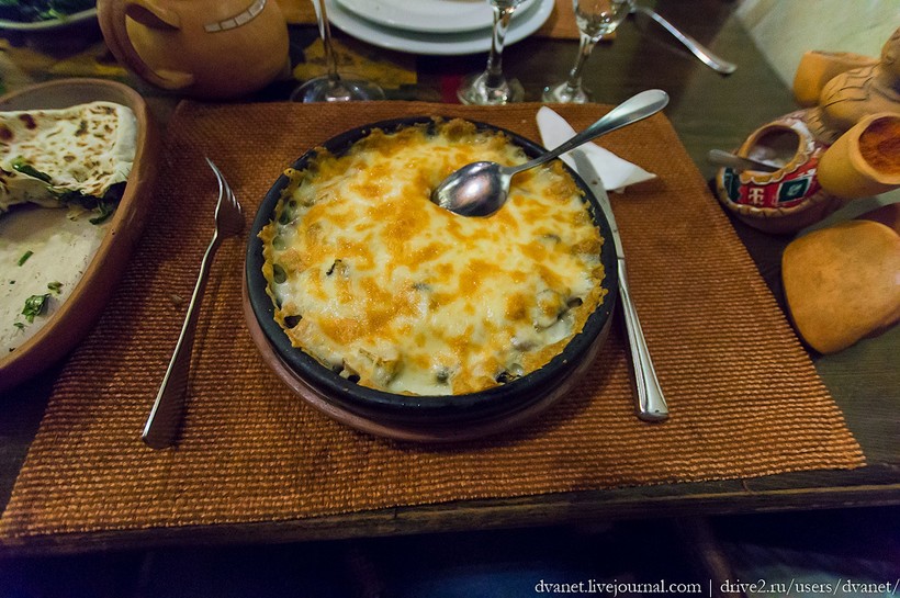 В меню было обозначено как гонио — неимоверной вкусности штука из мяса, грибов, картофеля и сулугуни. А лучше всего на голодный желудок заходит лаваш с зеленью, что виднеется слева.