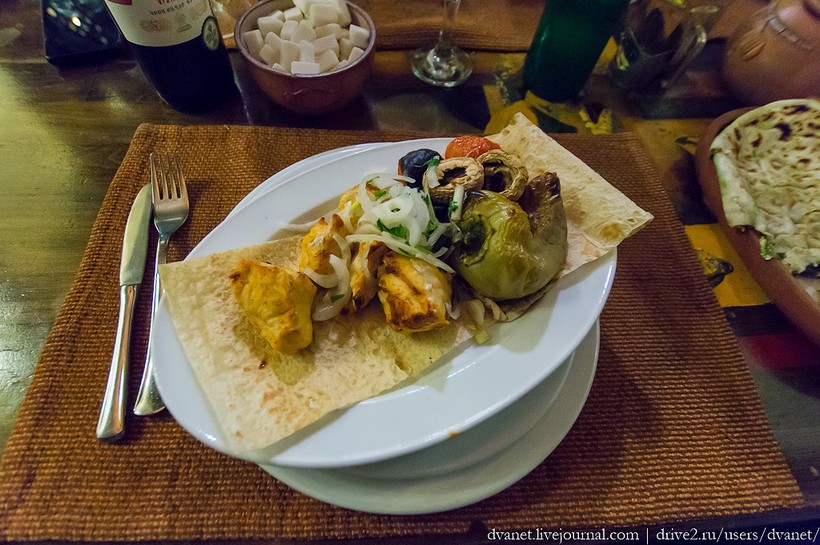 Эту штуку нам обозначили как адана, хотя сейчас поисковик говорит о турецком остром фарше, жареном на вертеле. По факту — куриный шашлык с овощами. На него больше дочка налегала.
