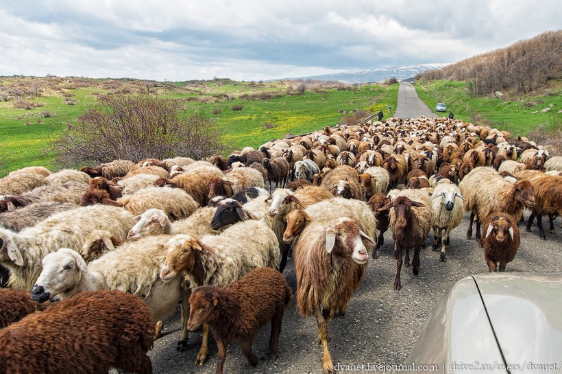 Кстати, практически в каждой встреченной нам по пути отаре виднелись рога одного или нескольких старых козлов. В прямом смысле. Оказывается, современной наукой разум внутри овцы до сих пор не найден. То есть они настолько глупы, что для облегчения управления этим стадом требуется внедрить в качестве вожака старого и мудрого козла, отличающегося логичным поведением.