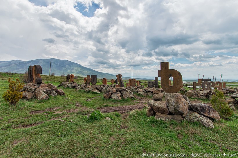 По пути заезжаем к памятнику армянскому алфавиту, созданному Месропом Маштоцем в 405 году.