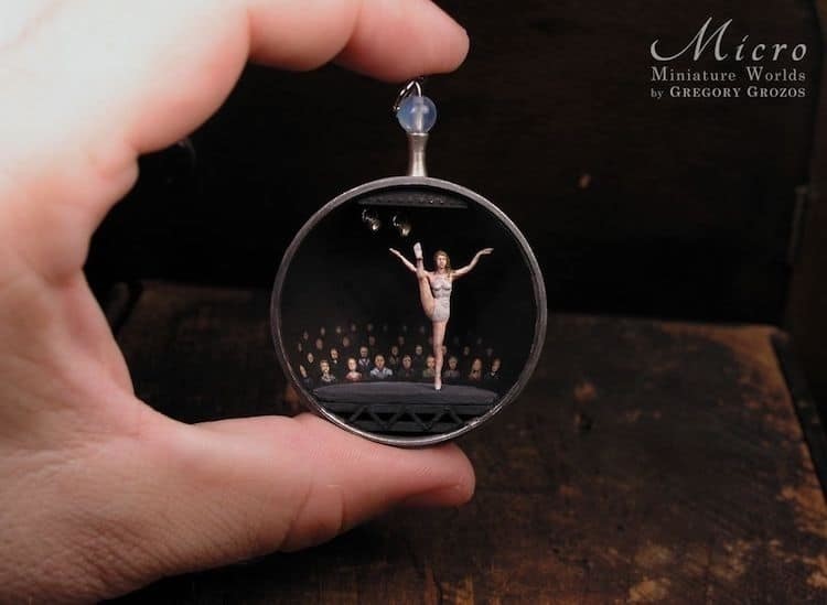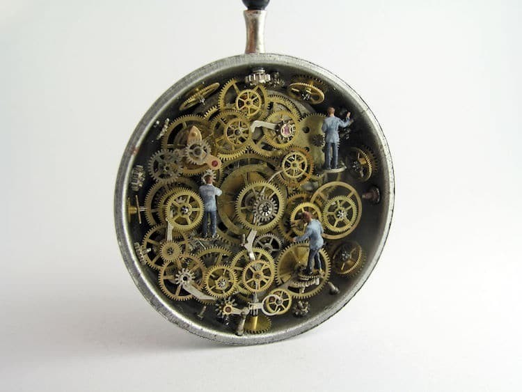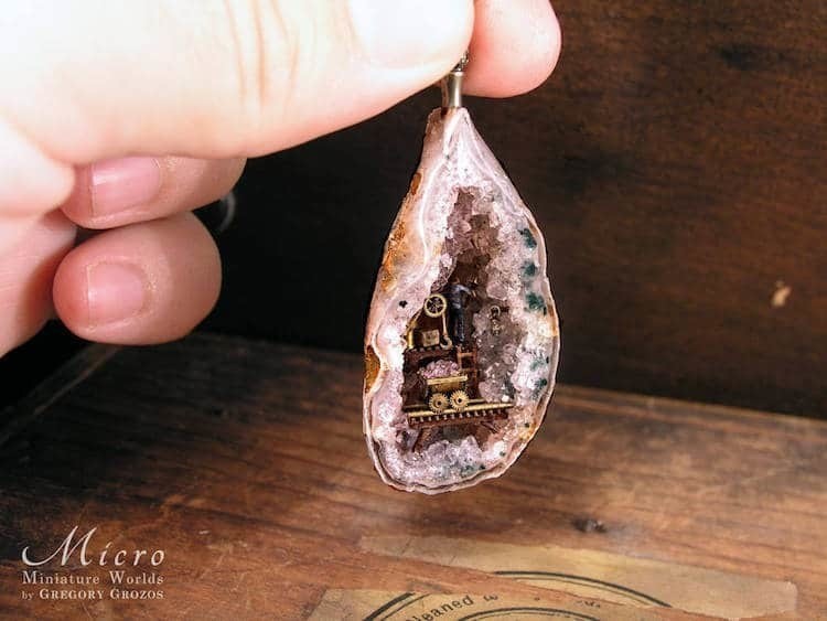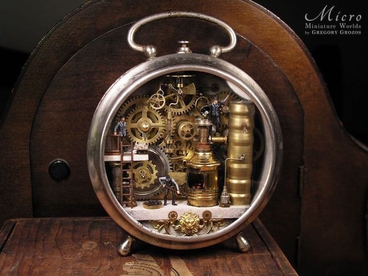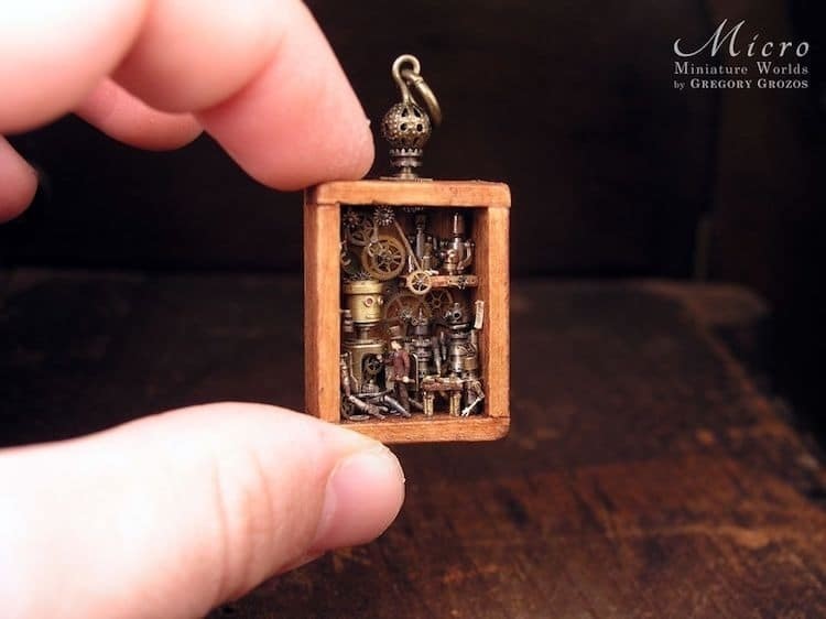 Грегори Грозос — удивительный художник из Греции, который дарит второе дыхание винтажным украшениям, заключая «параллельные вселенные» в старомодные часы на цепочках. Он черпает вдохновение в фантазийных образах, стимпанке и классическом искусстве, создавая хрупкие арт-объекты, рассказывающие истории выдуманных микрокосмов, в которых миниатюрные создания обитают в крошечных домах, трудятся на своих рабочих местах и наслаждаются природой.